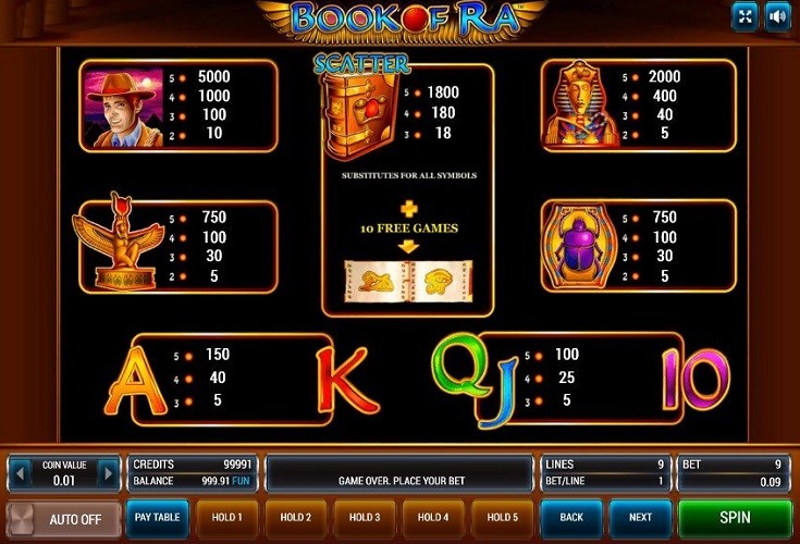 Cette Classique pour vous familiariser avec Book of Ra gratuitement, c'est certainement seulement nécessaire pour les débutants. Pour le reste de la communauté des joueurs, Cette machine à sous est depuis longtemps une taille introduite. Book of Ra online est d'autant plus douloureux en France que le fabricant Novomatic s'est retiré du marché Internet de la République fédérale avec ses machines à sous de la ligne de produits Novoline. En Suisse et en France, il ne devrait pas être difficile de trouver un Casino en ligne qui offre également gratuitement Book of Ra dans son portefeuille.