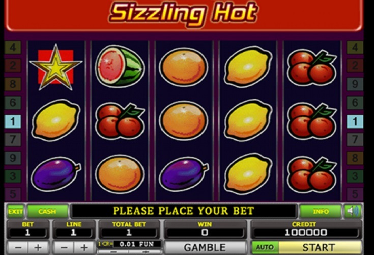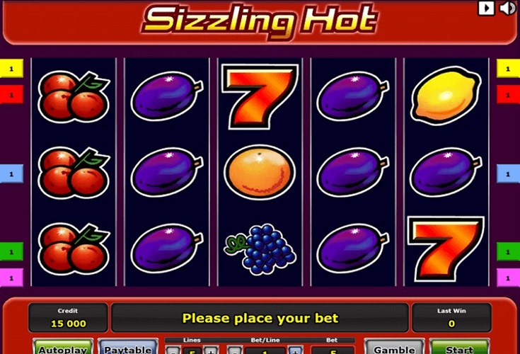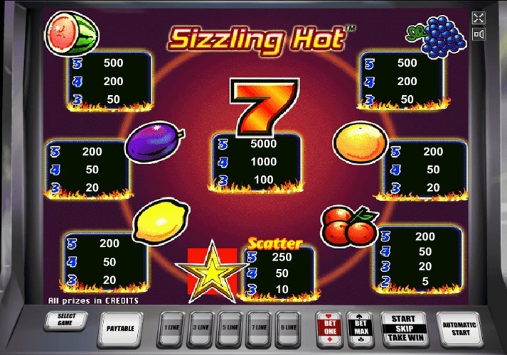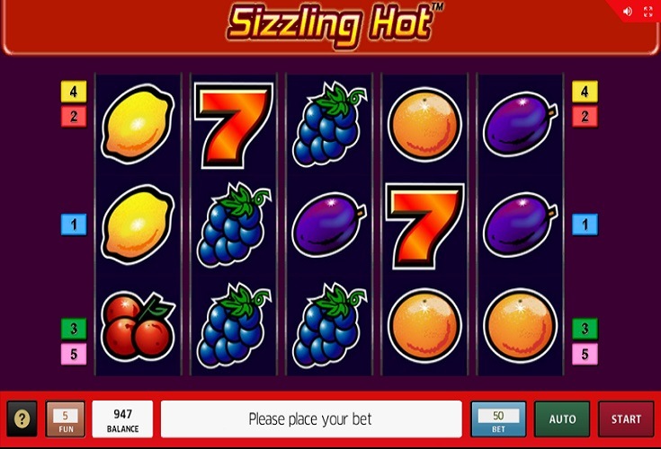 Sizzling Hot est très simple en termes de construction. Il y a 5 rouleaux et 5 lignes de paiement, la mise minimale par ligne est de 8 cents, donc il faut miser au moins 40 cents par tour. Chaque rouleau affiche différents symboles sous la forme de fruits, ainsi que des symboles spéciaux, y compris les cerises, les oranges, les prunes, les citrons, les raisins et les melons. A cela s'ajoute le nombre 7, qui est responsable du gain maximum, et un symbole dit Scatter ou Wild, qui remplace tous les fruits à volonté.