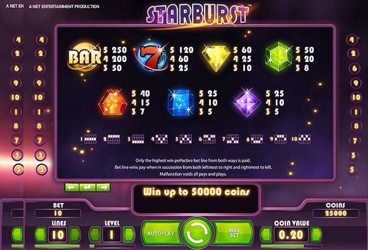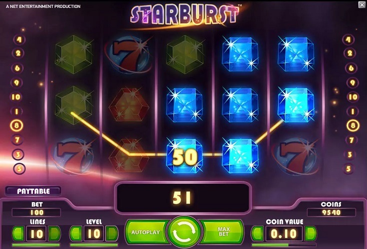 Starburst implique des multiplicateurs relativement élevés, ce qui rend les gains par combinaisons gagnantes élevés. Par conséquent, il est possible de se passer de tours gratuits.